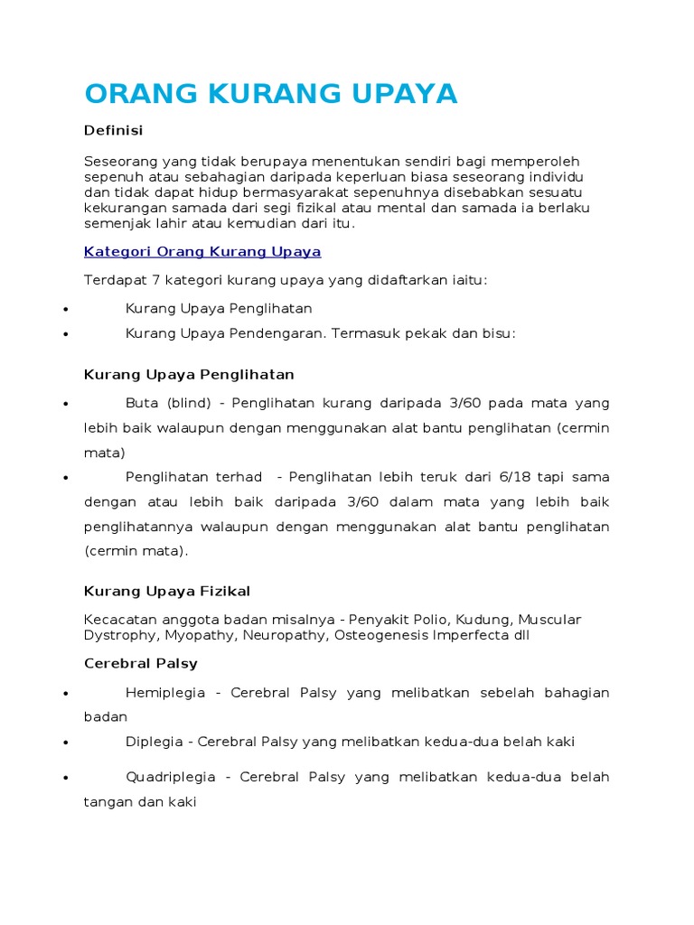 Definisi Orang Kurang Upaya Menurut from imgv2-1-f.scribdassets.com Documents similar to definisi orang kurang upaya menurut. Karangan naratif (menolong orang kurang upaya). Please note that orang kurang upaya is not the only meaning of oku. Terdapat 4 tahap yang boleh dikategorikan. Jenis kurang upaya jumlah kurang upaya penglihatan 12 874 kurang upaya pendengaran 15 876 kurang upaya fizikal 29 469 kurang upaya mental 28 129 jumlah 86 348. Dari sudut definisi pekerja kurang upaya dan penambahan aspek hukuman terhadap pelanggaran akta oku kata kunci: Rumusanoleh yang demikian, orang kurang upaya (oku) merupakan insan yang istimewa terpilih daripada tuhan dan perlu mendapat perhatian daripada walaupun pelbagai definisi diberikan yang menunjukkan halangan pekerjaan namun, di malaysia melalui pekeliling perkhidmatan bilangan 16. Orang tua memegang peranan yang amat penting untuk meningkatkan perkembangan dan prestasi anak.
